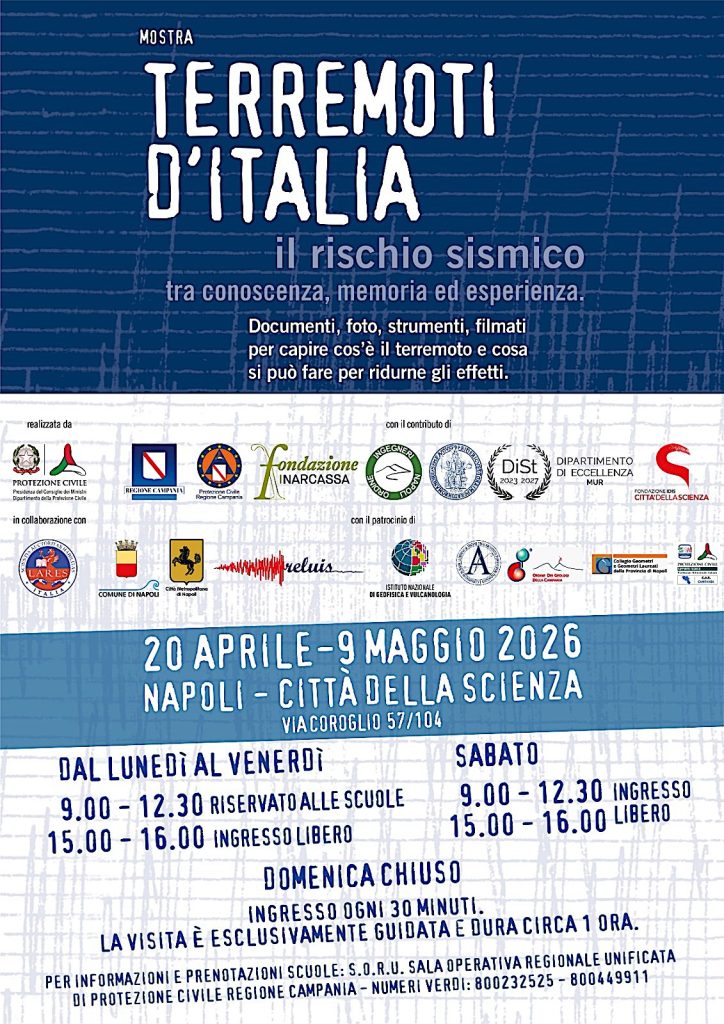 Torna in Campania la mostra itinerante e gratuita “Terremoti d’Italia”, promossa dal Dipartimento della Protezione Civile della Presidenza del Consiglio, in collaborazione con la Regione Campania: un percorso espositivo rivolto a cittadini e studenti per diffondere la comprensione del fenomeno sismico e i comportamenti utili per ridurne gli effetti.