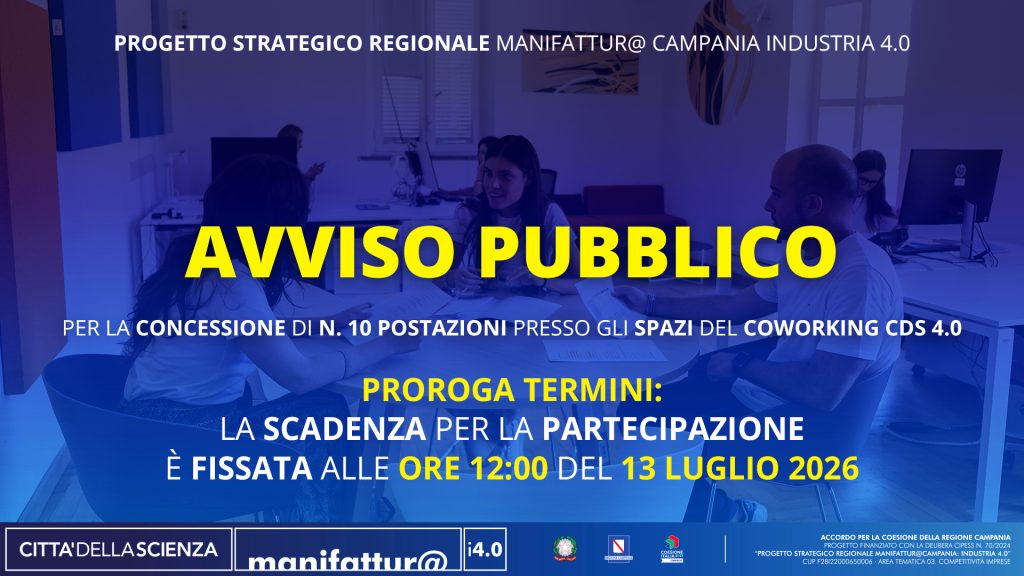AVVISO: Prorogato il termine per la partecipazione all’AVVISO PUBBLICO PER LA CONCESSIONE DI N. 10 POSTAZIONI PRESSO GLI SPAZI DEL CO-WORKING CDS 4.0 fino alle ore 12:00 del 13 luglio 2026.