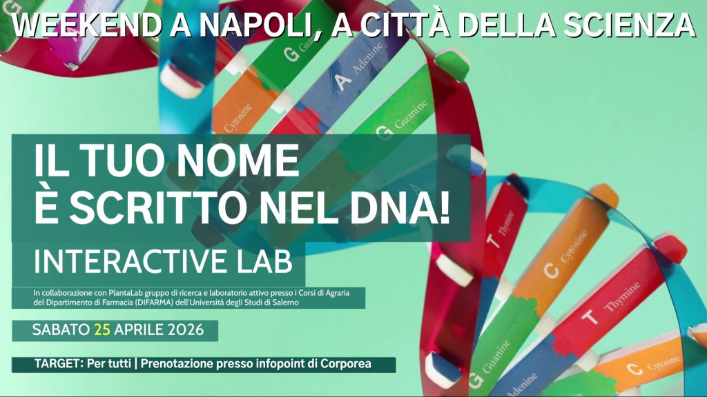 Trasforma il tuo nome in una vera sequenza di DNA usando le basi A, T, C e G! E per i più piccoli, non perdere l’occasione di creare coloratissimi braccialetti in cui ogni colore rappresenta una base del DNA! L’evento è realizzato in collaborazione con PlantaLab gruppo di ricerca e laboratorio attivo presso il Dipartimento di Farmacia (DIFARMA) dell’Università degli Studi di Salerno.
