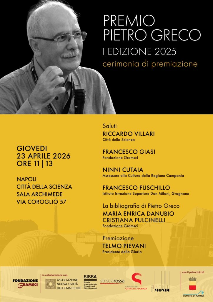Nel corso dell’evento sarà inoltre presentato il progetto di bibliografia degli scritti e degli interventi di Pietro Greco, a cura della Fondazione Gramsci.