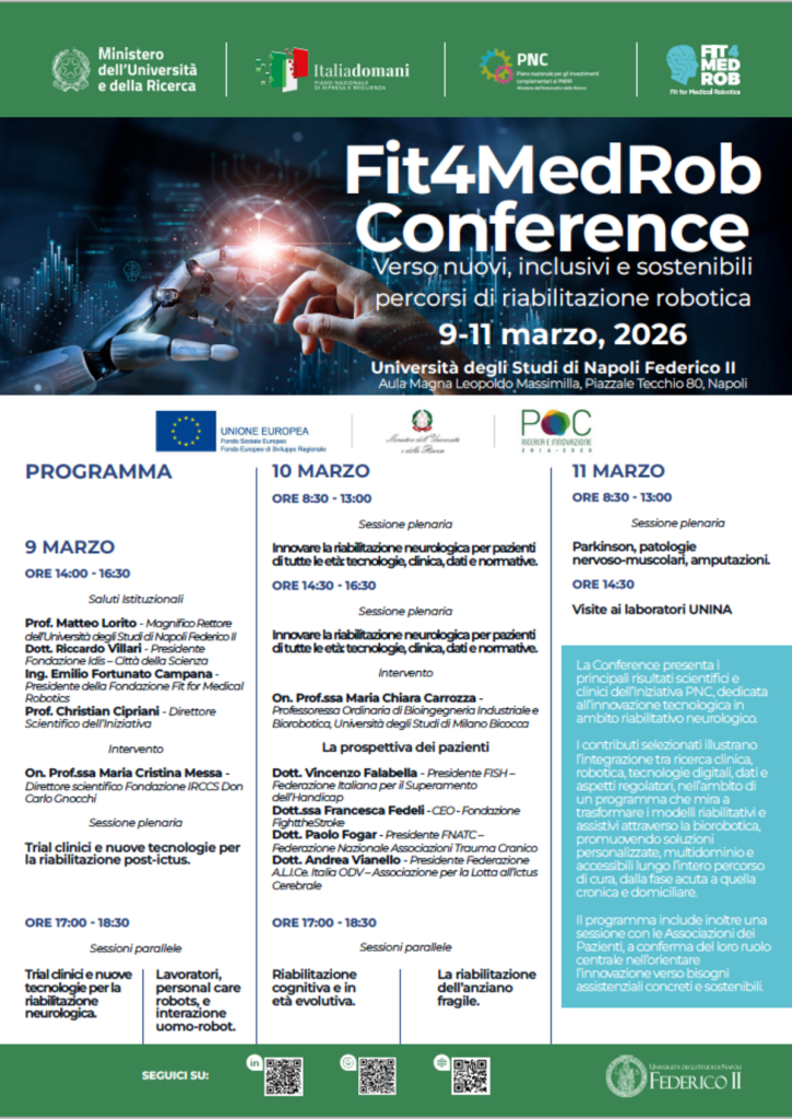 E’ stato inaugurato oggi lunedì 9 marzo 2026, presso l’Università degli Studi di Napoli Federico II, un appuntamento internazionale dedicato all’innovazione nella sanità: tre giorni di incontri, ricerca e confronto sul futuro della robotica medica e della riabilitazione nell’ambito del progetto Fit4MedRob – Fit for Medical Robotics.
